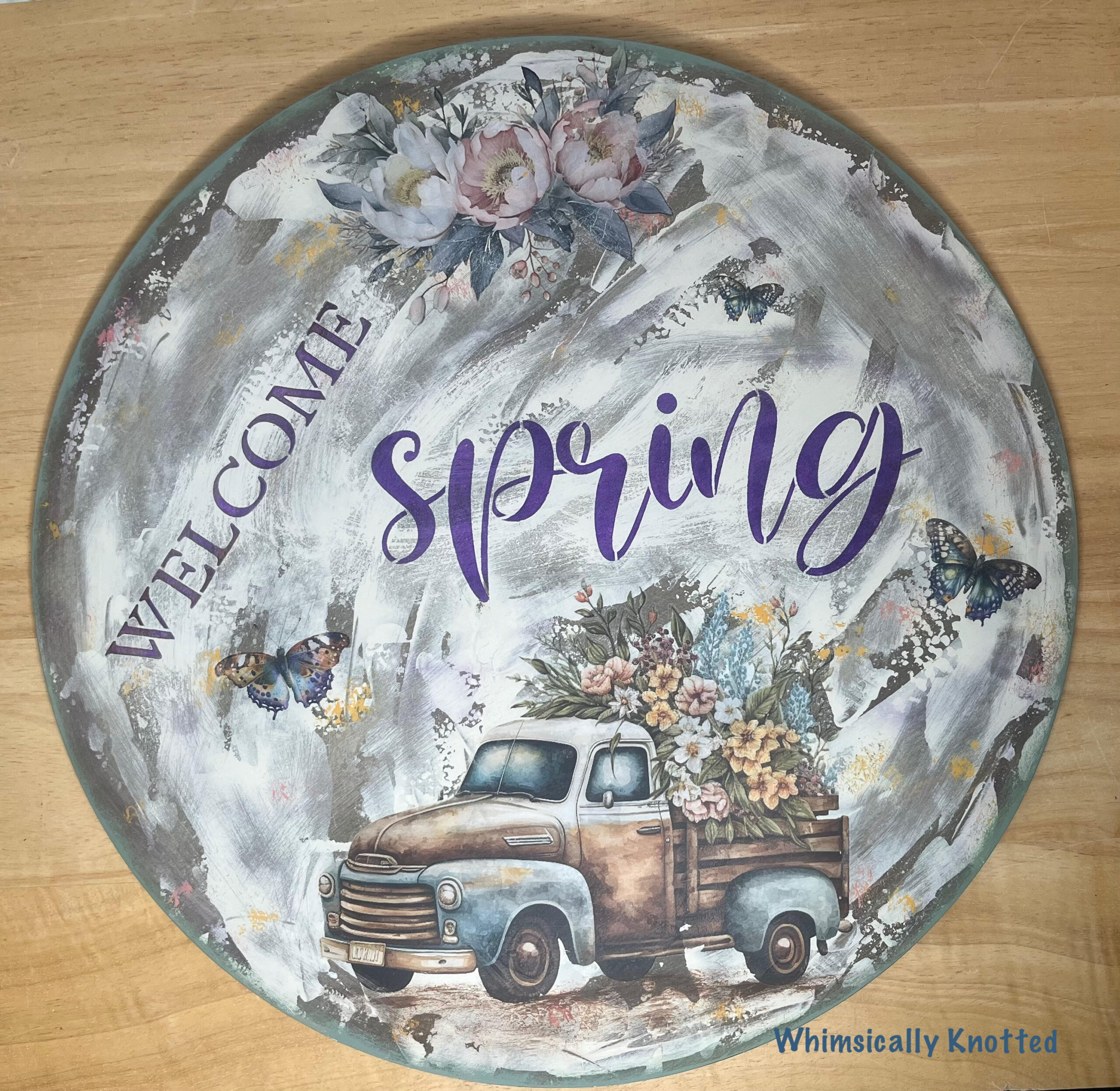 Spring Door Hanger is double sided on a 16” round. This spring and lavender door hanger is a beautiful combination of various transfers and stencils. The French lavender side has a pretty background in a soft light purple and green with a few raised green flourishes around the edge. The other side features an old rustic truck on a cream colored background created with a palette knife with splashes of color. The door hanger is sealed with Polycrylic.